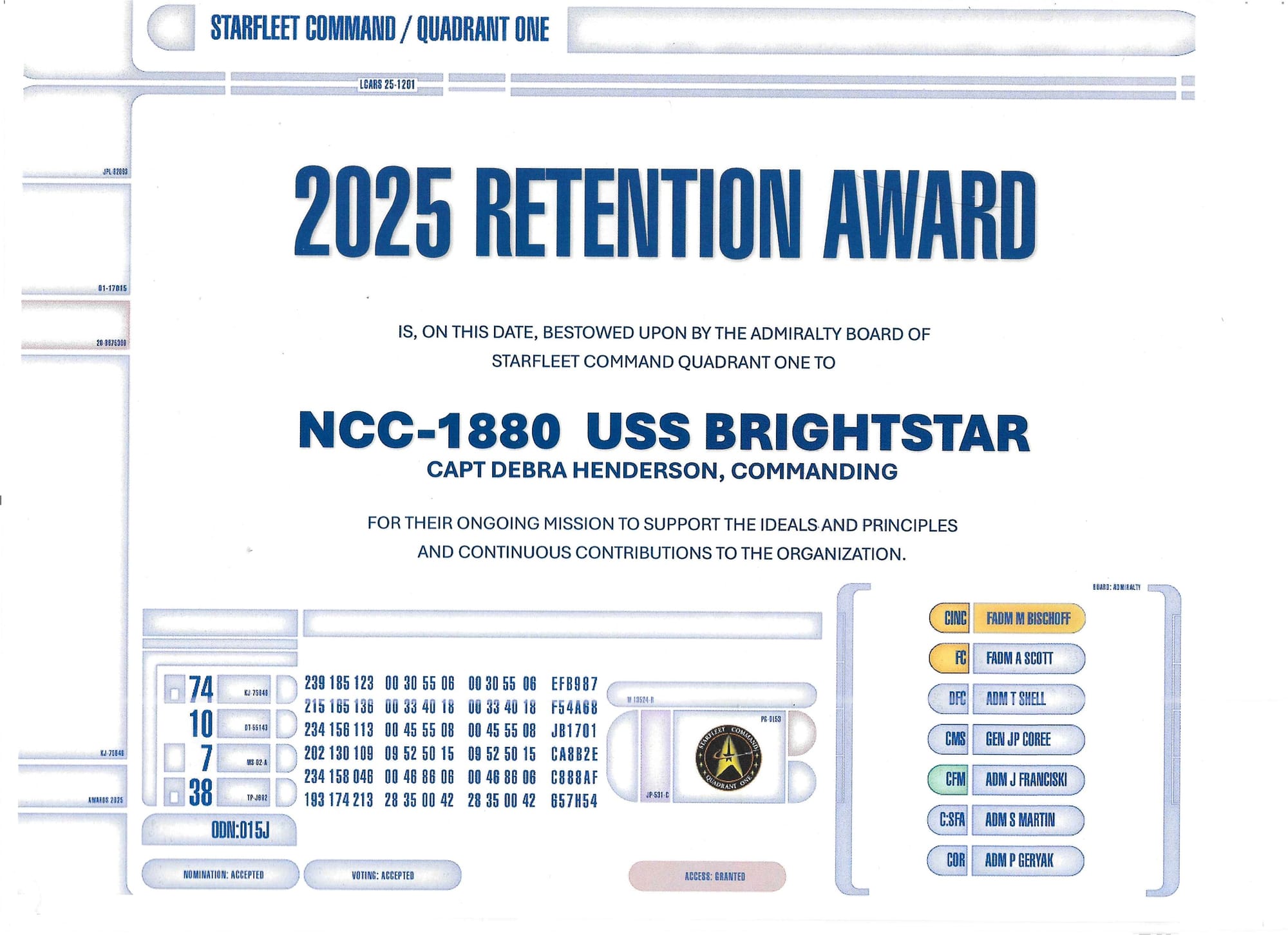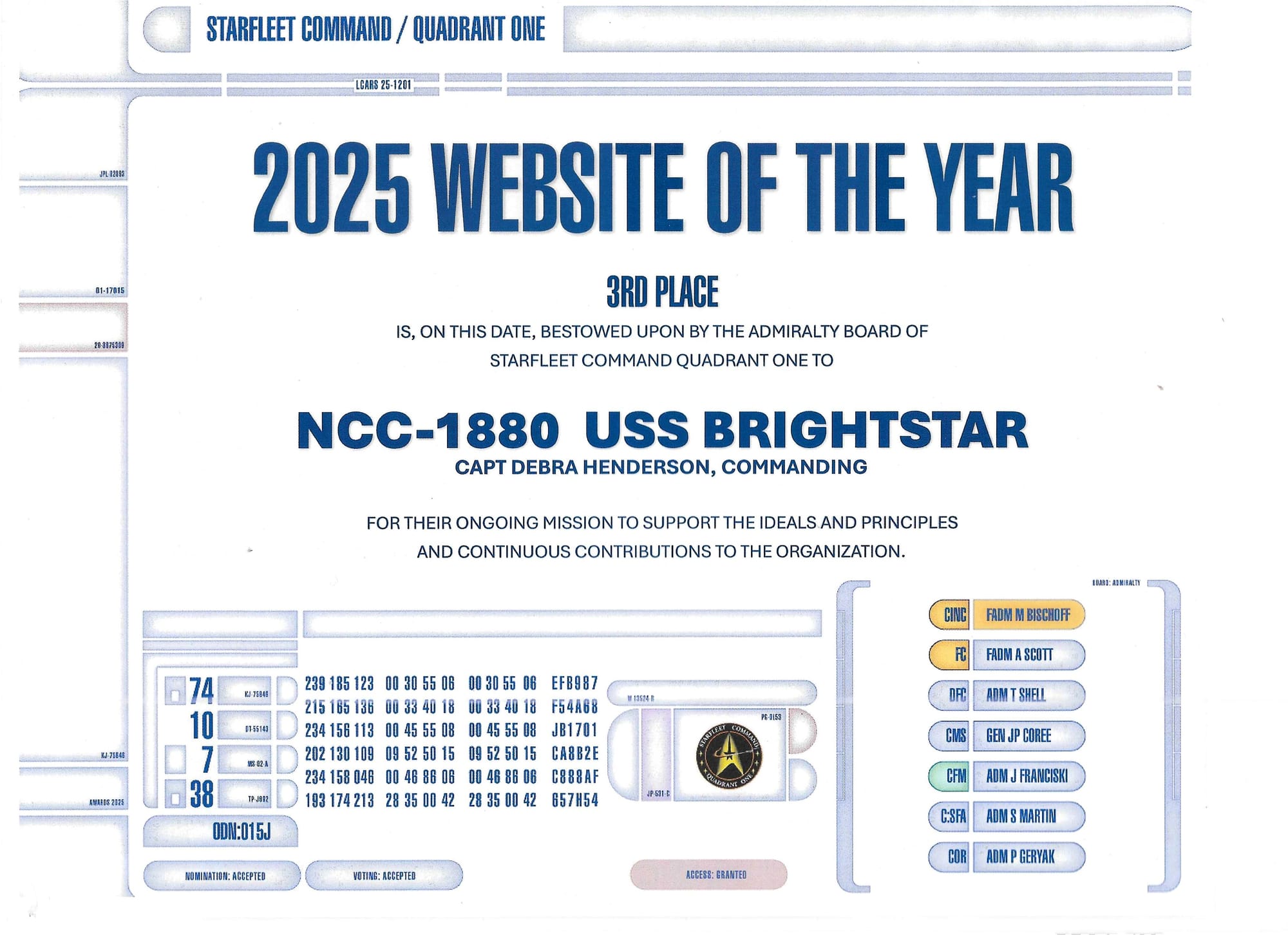 Shelby T. Hobbs ll started out as Chief Security Officer aboard the USS BRIGHTSTAR. While onboard the BRIGHTSTAR, he would make his way over to the Science Division and becoming its Chief Science Officer. While as Chief Science Officer, he would redesign the BRIGHTSTAR's ship logo. He'd later present the new design to the rest of the crew at a ship at meeting. The crew liked it so well, that it was officially adopted as the new logo for the BRIGHTSTAR.